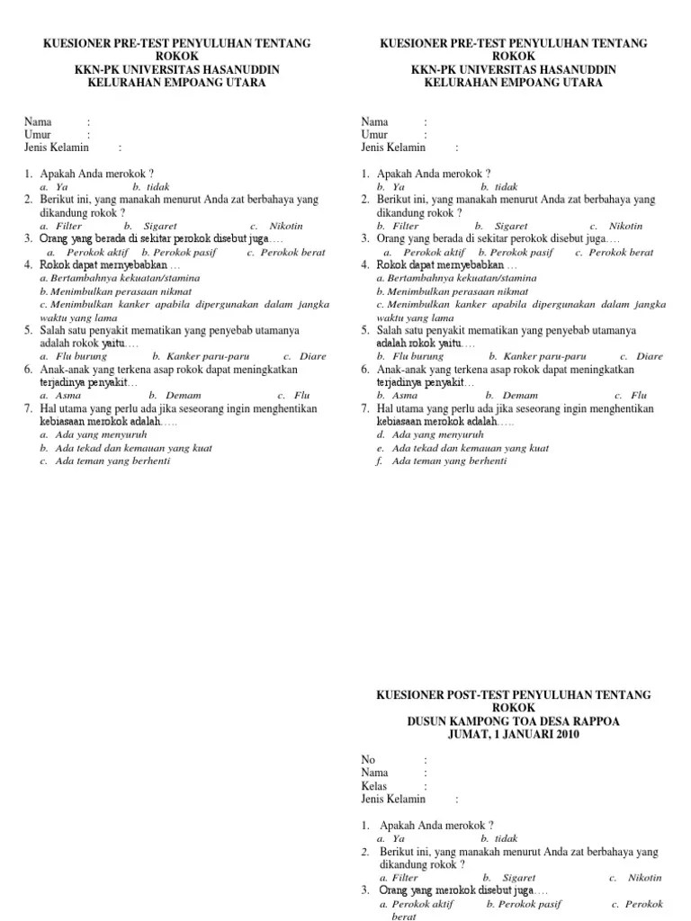 Contoh Soal Pre Test Dan Post Test Matematika Sd : Kuesioner Rokok Dan Sampah : Rini anggraini 1, idul adha2 ,andriana.